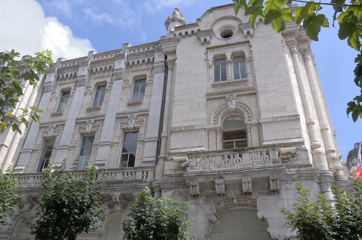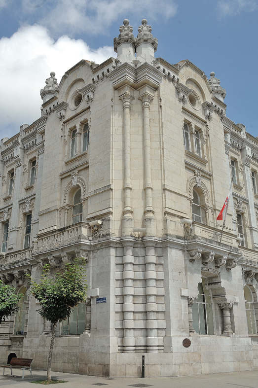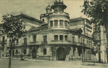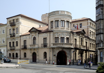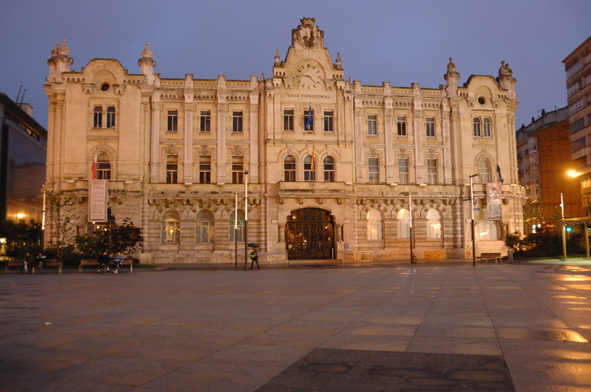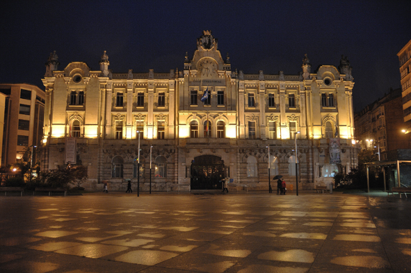 | Detalle de la fachada del Ayuntamiento de Santander iluminada por la luz sobrante de un escaparate cercano | Detalle de la fachada del Ayuntamiento de Santander iluminada por su propio alumbrado mas el alumbrado púlico. |
