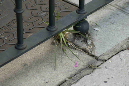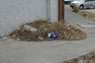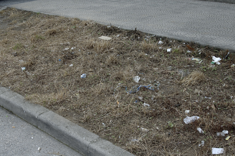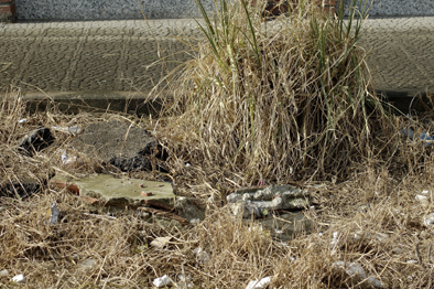 En esta otra foto, en el mismo sitio, vemos como después de una exaustiva limpieza encontramos un trozo de tabique, otro de asfalto, el plumero que domina la foto no lo extirparon (para que siga creciendo y extendiendo sus semillas), excrementos de perro, trozos de tejas y no se hasta que punto el veneno que utilizan para quemar la hierba se acumula en el suelo, lo que si es cierto es que cuando los caracoles que pastan y luego recojen los vecinos están contaminados del herbicida. |
